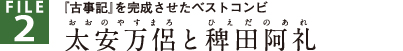 天武天皇の命で『帝紀』『旧辞』を誦習した稗田阿礼。いったん見たもの・聞いたことは忘れない、天才的記憶力と理解力を発揮した舎人だったという。この作業は天武天皇の崩御により一時途切れるが、後を継いだ元明天皇が「稗田阿礼誦む所」を撰録して献上するよう太安万侶に命令し、ここに『古事記』が完成した。