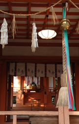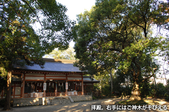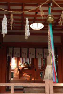 また社には天宇受賣命のほか、天孫降臨の際に道案内をしたとされる猿田毘古神(さるたひこのかみ)を副斉神として祀る。『日本書紀』では鼻が長く、背の高さ7尺(約212cm)余り、赤い顔を持つという身体的特徴が書かれており、天狗のモデルではないかとも言われる。天宇受賣命と婚姻関係にあったとされる猿田彦神は、土地・方位の神様。新築や移転などの際にお参りすると良い方向へ導いてくれるという。