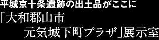 平城京十条出土品は、イオンモール大和郡山の2階にあるこちらで展示する。また、外周の緑地帯の5ヶ所に条坊道しるべが立てられているほか、羅城が見つかった場所には羅城の柱列を表したモニュメントが立つ。