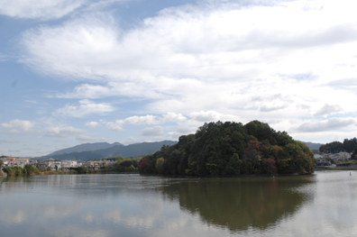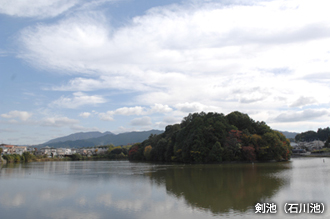 駅から交通量の多い車道を進むと、右側に大きな池が見えてくる。現在は石川池の名で呼ばれる剣池だ。古くは蓮の多い池だったようだ。皇極天皇の時代、1本の茎に2つの花が咲いた蓮があり、蘇我氏の繁栄を予告するものだとされたが、翌年、大化の改新によって滅ぼされる凶兆だったと伝わる。