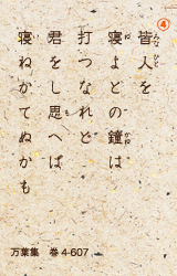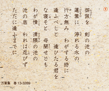 蓮をうたった作者未詳の歌がある。①「身に帯びる剣の池の蓮の葉に溜った水のように、行方も知らないあなたを思っている時に、逢うべきだと言って逢ったあなたなのに、母は寝てはいけないと言う。私の心は清隅の池の底のようには、じっと堪えられそうにない。じかに逢うまでは」。池の底にじっと水が湛えられて忍んでいる様子に切ない恋心をたとえている。