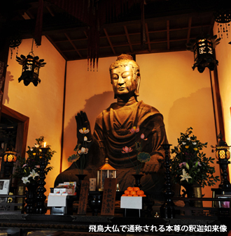 蘇我馬子の発願により創建された日本初の本格的寺院。「法興寺」「元興寺」とも称し、現・奈良市の「元興寺」の前身である。日本最古の仏像として有名な「飛鳥大仏」(本尊の釈迦如来像)は、国の重要文化財にもかかわらず間近で拝むことができるのが魅力だ。