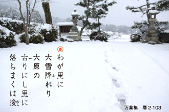 天武天皇が、⑥「わが里に大雪が降った。大原の古びた里に降るのは後だろう」と、大原にいる鎌足の娘・藤原夫人に送った。私のいるところはたいしたものだろうと。それに藤原夫人が応戦。「わが岡の 龗(おかみ)に言ひて 落(ふ)らしめし 雪の摧(くだ)けし 其処に散りけむ」(万葉集 巻2-104)。「私の住む岡の水の神に言いつけて降らせた雪のかけらがそちらに降ったのでしょう」。先に降ったなどと得意げに。いつの世も女性の方が一枚上手か。