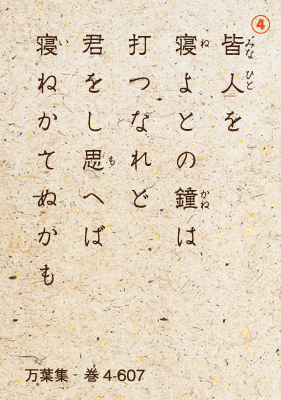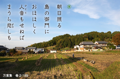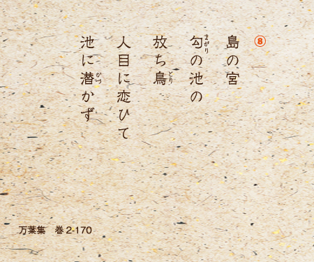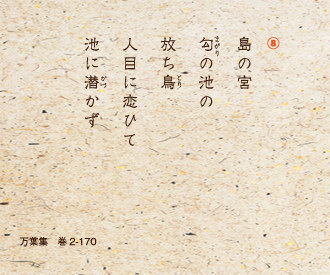 ⑧「島の宮の匂の池の放ち鳥は人の目を恋しがって池に潜ろうともしないよ」。草壁皇子が亡くなったことを悼み、柿本人麻呂が詠んだ挽歌。また、⑨「朝日が照る島の宮殿には、胸をしめつけるように人音もない。心から悲しいことよ」と、日並皇子と呼ばれた草壁皇子の舎人も同様に悲しみを詠んでいる。