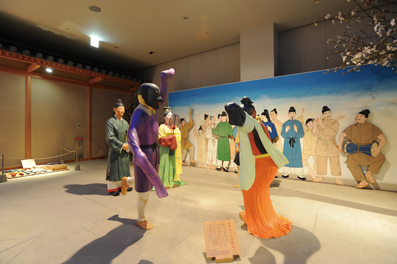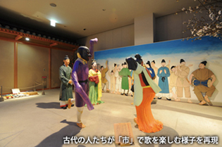 なかでも、地下1階の一般展示室の内容はどれも興味深いものばかり。歌の広場では、古代の市場や古代発音、アジアの歌垣など、万葉歌を中心とした古代の世界を、ジオラマやパネルなどで紹介。その他、万葉人の生活をインタビュー形式で答えていくクイズや、人形と映像とアニメーションを融合させた「万葉劇場」の上映など、遊びながら奥深い知識を得ることができる。富本銭をつくっていた飛鳥池工房遺跡の復元展示も見逃せない。