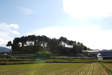 飛鳥坐神社の右横の登り坂を上がると、視界が開け、里山の風景が広がる。かつては「大原」と記された地。藤原鎌足の誕生地と伝える大原神社や、鎌足の生母である大伴夫人の墓と伝わる円墳が残る。