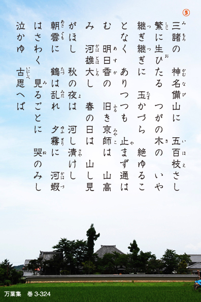 境内には山部赤人の歌碑が立つ。⑤「神の降りる山に多くの枝を広げて繁り生えている栂(とが)の木のように、次々と葛のつるの絶えないよう、絶えず通いたい飛鳥の旧都は、山が高く川は雄大である。春の日には山が見たいものである。秋の夜は川が清らかに流れている。朝の雲に鶴は乱れ飛び、夕べの霧に蛙は鳴き騒いでいる。美しい風景を見るごとに思わず泣いてしまう。都として栄えた頃を思うと」。