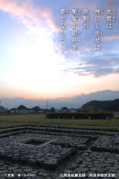 壬申の乱で大友皇子に勝利した大海人皇子は、飛鳥浄御原宮で即位の儀を行い、天武天皇となった。宮を造営した天武天皇を、大伴御行が称えている。⑦「天皇は神であり、赤駒が腹ばう田を都に造り替えられた」。天皇の権力の強大さをあらためて感じたのだろう。以後、藤原京へ遷都するまでの21年間、天武・持統天皇2代にわたる宮となった。