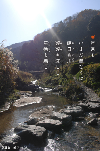 反歌「明日香河 川淀さらず 立つ霧の 思ひ過ぐべき 恋にあらなくに」(万葉集 巻3-325)。「飛鳥川の川のよどんでいるところに常に立っている霧のように、懐古の情は簡単に忘れてしまうものではない」。