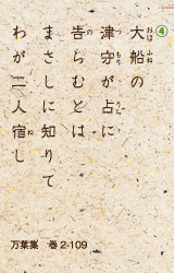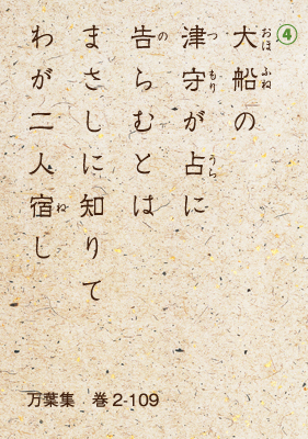 また、陰陽師の津守連通(つもりのむらじとおる)の占いで二人の関係が露見したときは、④「大船の泊(とま)る津守の占いに出るだろうことを知っていて二人で寝たのだ」と、二人の関係が世間に知られても構わないと開き直っているように捉えることができる。それほどこの恋に身を焦がした。