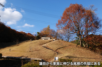 下山は、「馬の背」から祐泉寺へと向かうルートをたどる。鬱蒼とした道を下るが、登りのルートに比べ、ずっと歩きやすい。足取り軽く、雄岳の尾根の先端にある鳥谷口古墳へとたどり着く。7世紀後半に築造された、一辺が約7.6mの方墳で、1983(昭和58)年の土砂採掘中に偶然見つかった。大津皇子の墓ではないかとの説もある。