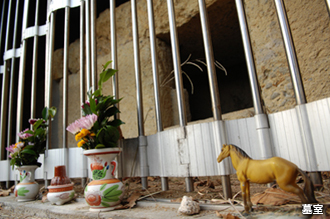 墓室は、二上山で産出された凝灰岩を使用した、東西に長い横口式石槨(よこぐちしきせっかく)という構造。底石や側壁には家形石槨の蓋石が転用されており、珍しい造り。墳丘や石槨の前面から、須恵器や土師器が発掘された。
