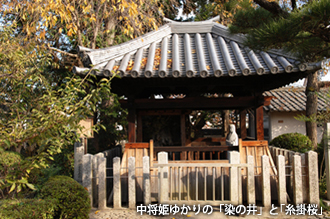 ここに中将姫の伝説が残る。姫が曼荼羅を織るために蓮の茎を集めて糸を撚り、井戸水に浸して傍らの桜の木に干していたところ、その糸が五色に染まったという。境内には中将姫が使った「染の井」の井戸と、糸をかけた桜の木が残されている。