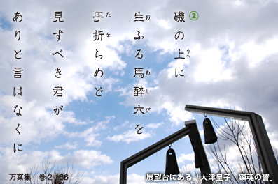大津皇子の遺体が二上山に移し葬られる時、姉の大伯皇女(おおくのひめみこ)が哀しみ悼んで詠んだ歌が2首ある。