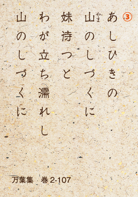 大津皇子には、石川女郎(いしかわのいらつめ)という、心から愛する女性がいた。③「あしひきの山の雫に妹を待つとて私は立ちつづけて、山の雫ですっかり濡れてしまった」とうたっている。男が女のもとに通う風習があった時代に、身分の高さをいとわず山の雫に濡れながら愛しい人をずっと待ったとある。