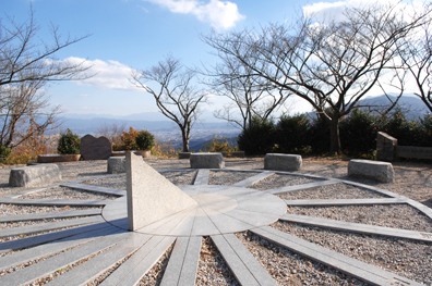 二上山の麓に広がる自然豊かな公園。木製の遊具やおもちゃ館、水辺のテラス、芝生広場など、子供たちが思いっきり遊べる遊具や施設が整備されていて、家族連れも目立つ。公園の奥に歩くと、急勾配の石段が目に飛び込んでくる。天に向かって反り返るように伸びており、その段数は、なんと456段! 「健康のために」と、456段を往復する地元の方の姿も見られる。階段の両側には梅雨時期になるとアジサイが満開に、秋は紅葉に染まる。階段を上りきった先には「国見の丘」。万葉学者・犬養孝氏による「大津皇子 鎮魂の響」と書かれた鐘があり、時おり風に揺られて、物悲しい音色を奏でる。展望台から一望する奈良盆地は、まるでミニチュアの世界のよう。