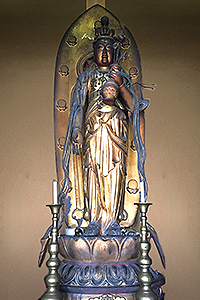 町なかで、ひっそりと祀られている十一面観音立像。今日も、目の病気やあれこれと悩める人たちの参拝を慈悲の心で待っておられる。
