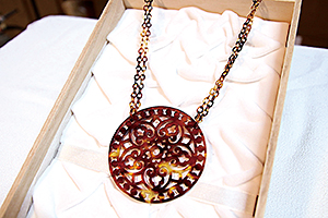 べっ甲細工は歴史のある美術工芸品ですが、常に新しいアイデアを取り入れることで、時代に合ったものになります。最近では、正倉院に納められている宝物の絵柄を取り入れたデザインや、貝、琥珀、珊瑚、白檀(びゃくだん)、カメオなどの素材と組み合わせた作品づくりなど、よりべっ甲に興味を持っていただけるように新しい挑戦を続けています。