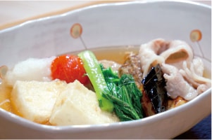 - ナスは一口大に切り、大和まなは下茹でし、7cmの長さに切る。ゴボウは5cmの長さに切り、レンコンは厚さ4~5mmの薄切りにし、豆腐は8等分に切る。豚肉は食べやすい大きさに切る。