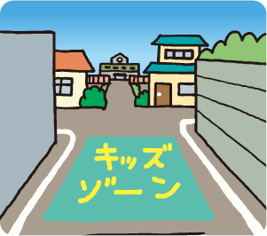 「キッズゾーン」とは、保育所の園児が園外で散歩する時などに安全に歩けるよう、施設を中心として、500メートルの範囲を目安に市町村が設定する区域です。