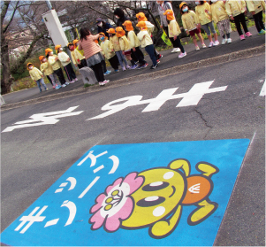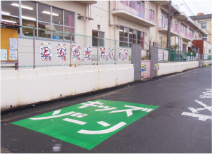 「キッズゾーン」内には、自動車の運転手などに注意喚起をするため、日常的に園児が集団で移動する経路であることを示す表示があります。
