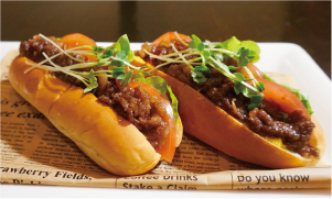 - 6の切り口に5のソースをたっぷり塗り、レタス、トマト、牛しぐれ煮をはさみ、最後にカイワレ菜を添えて完成。