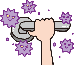 ドアノブや便座など家族間で共有するものを介しての接触感染を防ぐため、共有するものを触る前後に手指衛生を行ったり、共有するものを消毒しましょう。