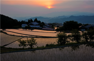 御所市にある菩提寺の周辺には棚田が広がり、遠くには大和三山が望めます。田植えの頃には、田に満々と湛(たた)えられた水に光が反射する幻想的な風景が見られます。
