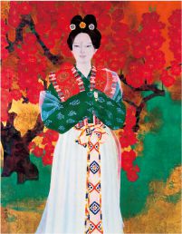婚礼の儀式には祈りと喜びの感情が満ちあふれています。花嫁を美しく彩る婚礼衣裳やさまざまな調度品には、幸せを祈る色や形、模様が用いられました。