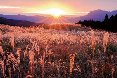 日本300名山の一つ倶留尊山。この山から亀の背に似た亀山を結ぶ西麓に広がるのが曽爾高原です。曽爾高原はススキで一面に覆われた草原で、秋にはススキの穂が日差しを浴びて銀色・金色に輝きます。