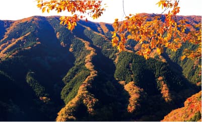 常緑の針葉樹の中で尾根筋だけに山桜などの広葉樹が残り、秋にはそれらが紅葉し美しい景観となります。