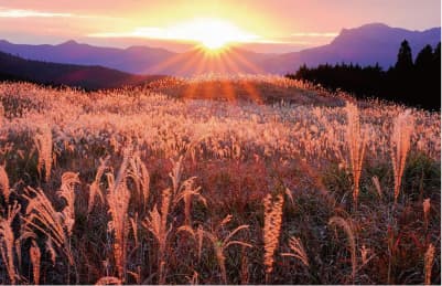 日本300名山の一つ俱留尊山。この山から亀の背に似た亀山を結ぶ西麓に広がるのが曽爾高原です。曽爾高原はススキで一面に覆われた草原で、秋にはススキの穂が日差しを浴びて銀色・金色に輝きます。