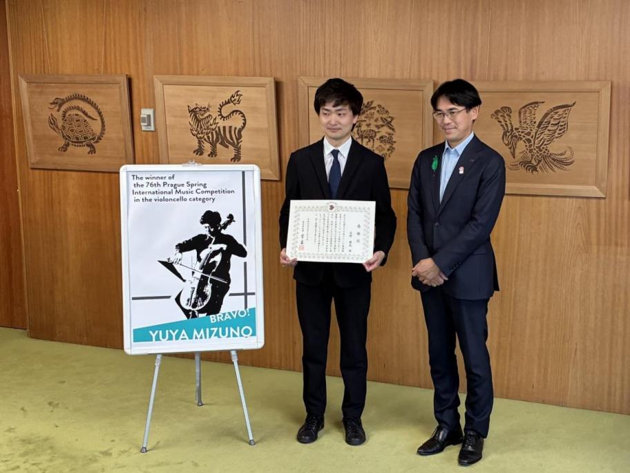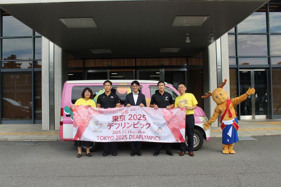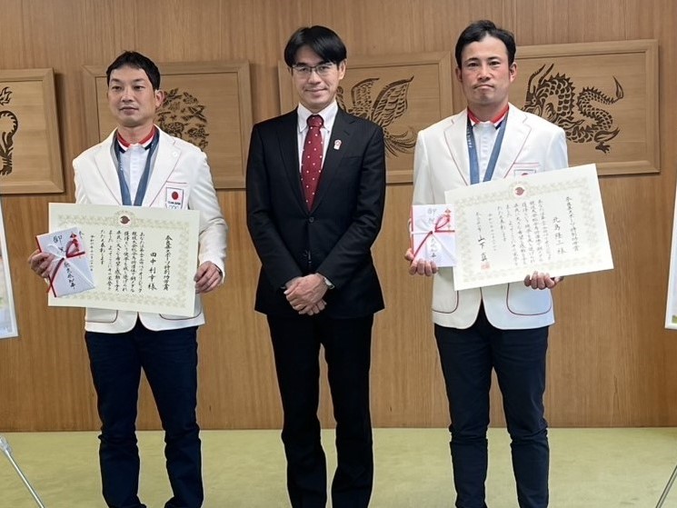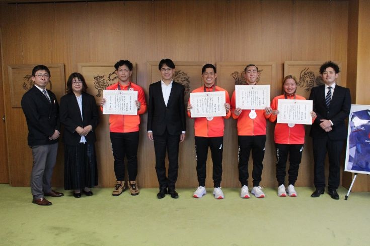 奈良県スポーツ特別功労賞表彰式を開催し、東京2025デフリンピックで銅メダルを獲得された水掫瑞紀選手、金持義和選手、星泰雅選手、齋藤京香選手に、山下知事が表彰状を授与しました。柔道の水掫選手は五條市出身、水泳の金持選手・星選手・齋藤選手はスイムピア奈良を活動拠点とされています。