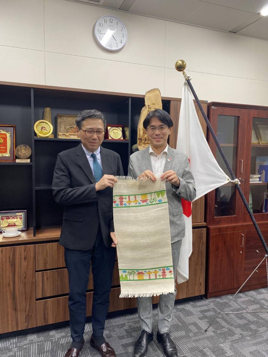その後、ともにイベントを視察。山下知事は経済・観光セミナーで挨拶を行い、最後に、記念品として大使より民族衣装をいただきました。