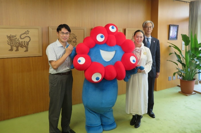 6月13日、2025年大阪・関西万博のテーマ事業プロデューサーである河瀨直美監督、日本国際博覧会協会高科副事務総長、マスコットキャラクターのミャクミャクが、山下知事を表敬訪問されました。
