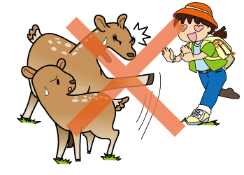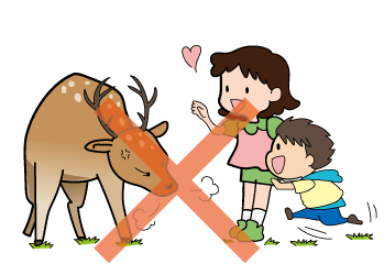 奈良公園のシカは野生動物ですので、攻撃することがあります。不用意にシカに触れたり、子どもだけでシカに近寄ったりしないでください。