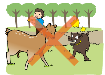 犬に驚いて、人身事故や交通事故の原因になったり、犬に襲いかかったりすることがあります。散歩するときは、短いリードをつけ、犬をシカに近づけないでください。