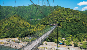長さ297m、高さ54mの生活用としては日本一長い吊り橋は、歩くたびにゆらゆらと揺れ、まるで空中を散歩しているかのよう。勇気を振り絞って渡れば、十津川の美しい渓谷美が目の前に広がります。