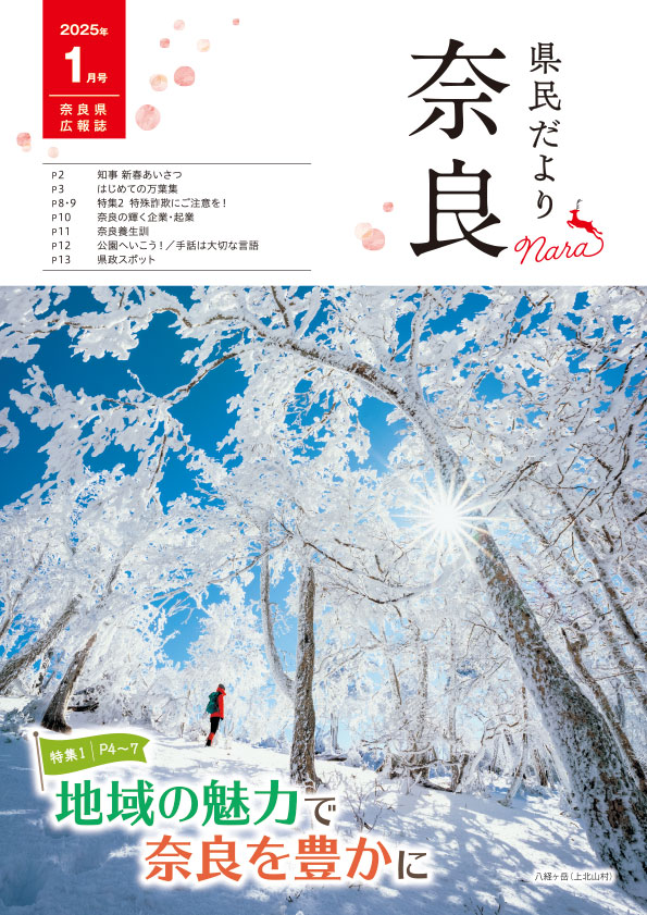 | 4~7 | 特集1 | 地域の魅力で奈良を豊かに | 特集1(PDF:3,338KB) | 特集1(MP3:7,671KB) |