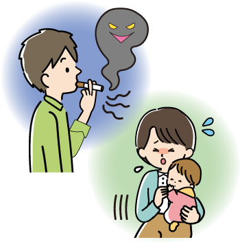 - 喫煙者の吐いた息、毛髪や衣類、部屋などの表面に付着して残留した化学物質からも受動喫煙は発生するため、加熱式たばこでも受動喫煙は発生します!