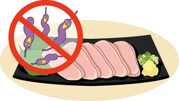 ニワトリやウシなどの腸管内にいる細菌。少量の菌数でも食中毒を発生させる。熱に弱い。鶏のさしみ、レバさし、たたき、とりわさなどの生、半生、加熱不足の鶏肉料理が原因で食中毒を起こすことが多い。 - 食中毒の症状