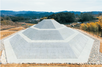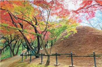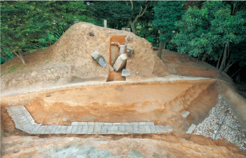 乙巳(いっし)の変(645年)にはじまる一連の政治改革「大化の改新」の薄葬(はくそう)令によって豪族の造る古墳の規模が規制されました。さらに天皇を頂点とする中央集権体制の確立に向け、最上位の墳墓(ふんぼ)として新たに生み出されたのが八角墳です。八角墳という形態は中国の宇宙観に基づき、日本独自に創出されました。「飛鳥・藤原」には牽牛子塚(けんごしづか)古墳、天武(てんむ)・持統(じとう)天皇陵(てんのうりょう)古墳、中尾山(なかおやま)古墳があります。