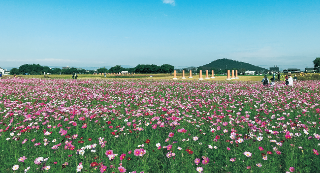 大極殿跡の南側一面に植栽されたコスモスは、例年10月上旬~下旬※に見頃を迎えます。