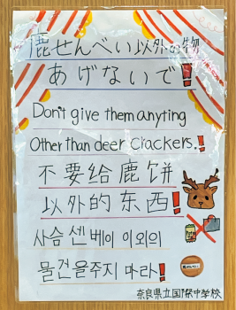 中学1年生が、校外学習での気付きから奈良公園でゴミ拾い活動を実施した際に、外国人観光客が多い奈良公園周辺では多言語での注意喚起が効果的ではないかと考えポスターを作成しました。ポスターは奈良公園バスターミナルに掲示しています。