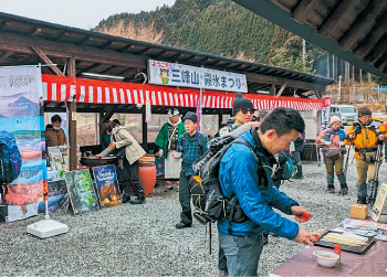 厳冬期に霧氷鑑賞ができる三峰山。その麓で、地元特産品の販売や登頂カードの発行、各種イベントを実施します。