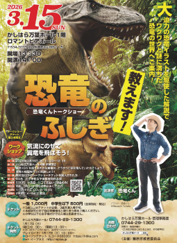 恐竜の素朴な疑問から最新の発掘・研究までを、誰もが親しみやすい言葉と大迫力の恐竜イラストを駆使して、クイズを交えながらわかりやすく解説します!チケットは、かしはら万葉ホール、ローソンチケット・e+で1月17日から販売。