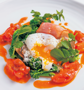 ポーチドエッグと温かいサラダ〜チェリートマトソース添え〜