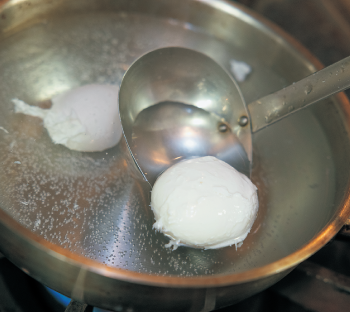 - 鍋に1リットルのお湯を沸かし、酢30ミリリットルを加える。お湯がふつふつ沸いてきたら(※90から95℃が目安)、卵を静かに割り入れる。お玉で白身をまとめながら2分ゆでて取り出し、お湯をきる。