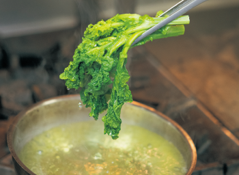 - 菜花は根本の硬い部分を切り落とし、塩茹でする。葉っぱの緑色が濃くなったら取り出す。