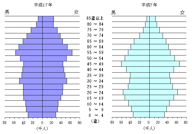 図2 奈良県の年齢(5歳階級)、男女別人口(平成7年・平成17年)